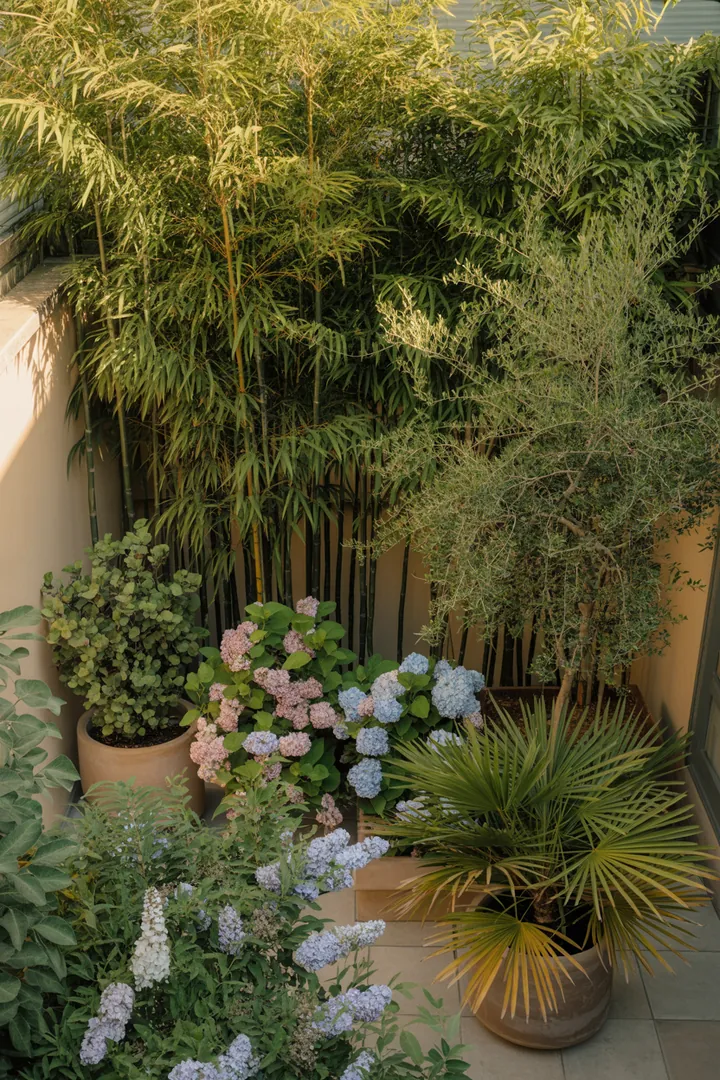 Große Pflanzen können den Balkon schnell kleiner wirken lassen. Mit Lichtfenstern und Staffelung bleibt es hell.