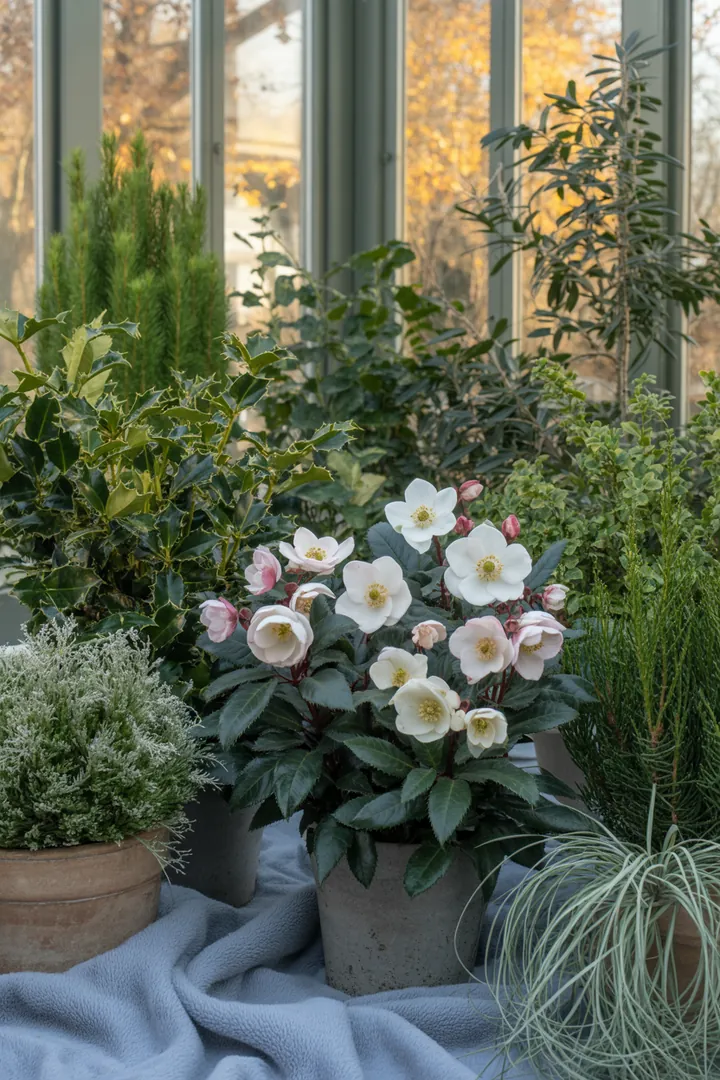 Frostresistente Pflanzenarrangements mit Christrose, Skimmie und Heide, umgeben von Zwergkiefer und Ilex, geschützt durch Vlies und Topf-Isolierung.